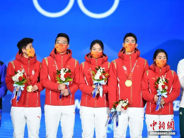 2月6日晚,北京冬奥会短道速滑混合团体接力颁奖仪式举行。图为范可新、任子威、曲春雨、武大靖、张雨婷(左至右)获颁金牌。中新社记者 李骏 摄