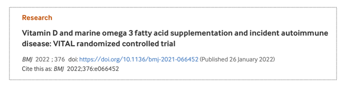 ① Vitamin D and Marine n-3 Fatty Acid Supplementation and Prevention ofAutoimmune Disease in the VITAL Randomized Controlled Trial. retrieved ACRConvergence 2021.