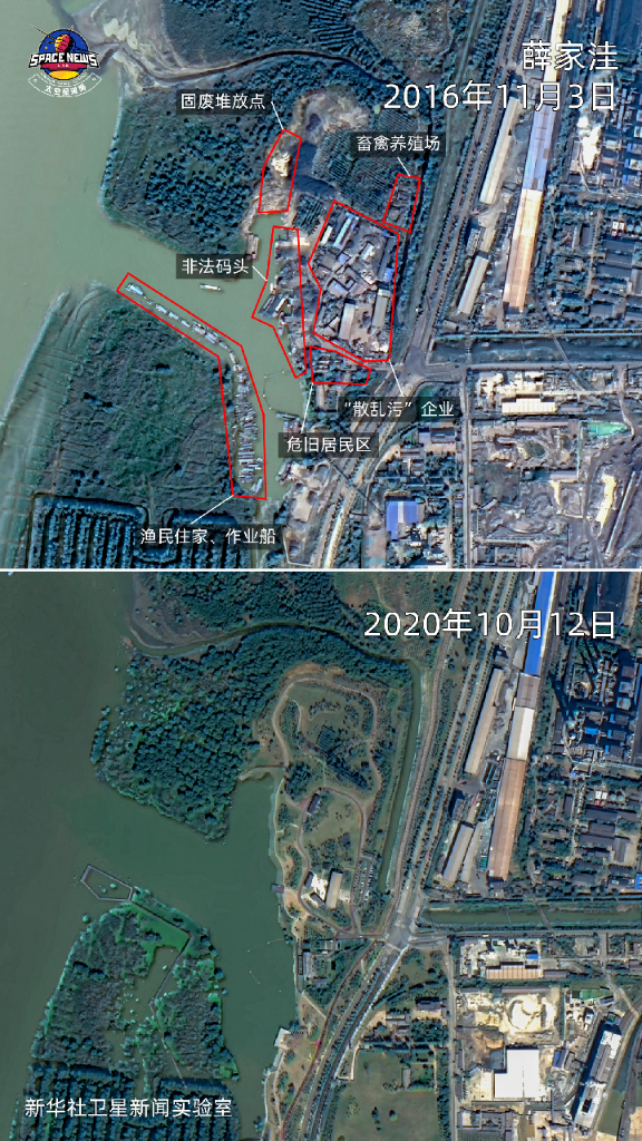 芜湖十里江湾便是其中之一。卫星“跨越时空”拍摄的图片显示,芜湖十里江湾船舶中介、运输繁荣一时,导致固废堆放、岸边毁绿种菜等乱象丛生。2021年11月3日的卫星图显示,这里拥挤杂乱的工厂、渔船和裸露的地块均已消失,宛如披上一层“绿衣”,郁郁葱葱的林木间,整洁的步道沿江蜿蜒。