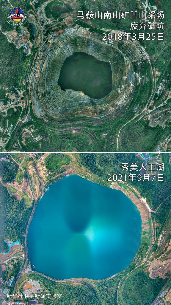 一颗圆形“蓝宝石”吸引了我们的目光。查看既往监测数据,这里曾是马鞍山一座有着百年开采历史的凹山采场,是华东地区最大的露天铁矿。历经注水填坑,成为一座巨大的人工湖——凹山湖。2021年6月,当地启动凹山湖生态修复示范点项目,进行土壤修复、流域治理、矿山修复、林木种植等,令废弃矿山“染”上更多颜色。
