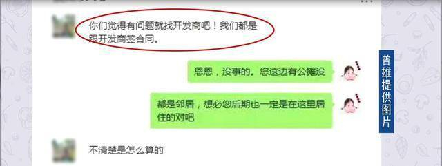 连日来,曾先生和其他业主们多次联系小区20栋1号房和10号房的业主,其中一户高楼层1号房的业主在微信中表示:“我是另外付了装修费和大额茶水费的”、“我是通过正当手续买的”、“你们觉得有问题就找开发商吧!”、“我们都是跟开发商签合同”、“面积两百多”。