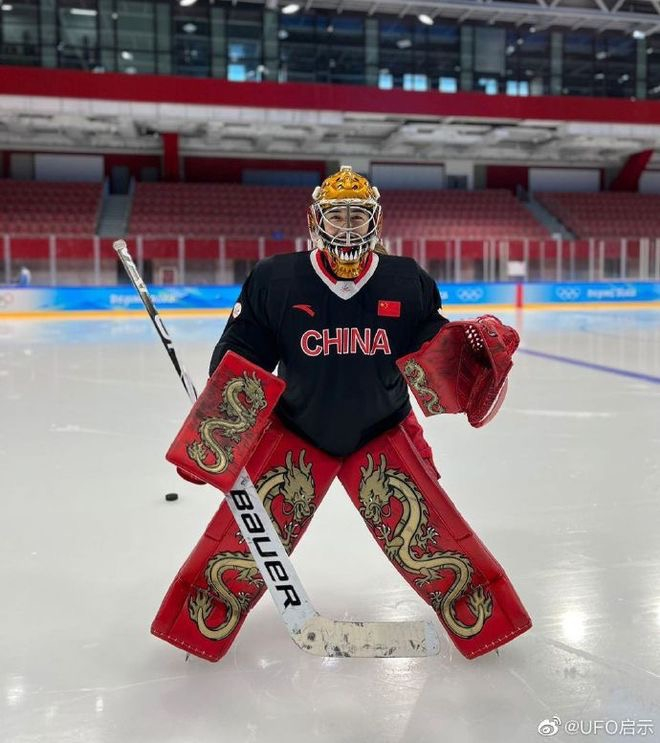 在首场3:1战胜丹麦的比赛中,“中国女子冰球守门员的护具太帅了”就登上了热搜,在比赛开始前,转播镜头中,周嘉鹰因为佩戴护具,在走向赛场的路上就显得十分霸气!有网友把她的护腿称为“龙腾虎跃明墙盾”。 随后也有微博博主晒出了周嘉鹰的比赛装备照片,金色的龙头盔加上全身带着龙图案的护具,霸气十足。