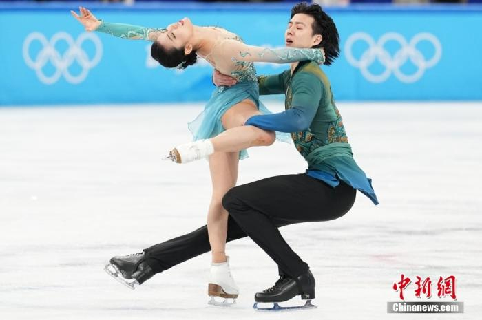2月14日,北京冬奥会花样滑冰冰上舞蹈自由舞比赛在首都体育馆举行。中国选手王诗玥/柳鑫宇穿着灵感源于《千里江山图》的“青山绿水”式样比赛服登场。图为王诗玥(左)/柳鑫宇在比赛中。中新社记者 崔楠 摄