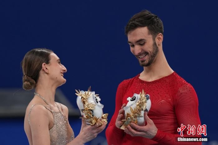2月14日,北京2022年冬奥会花样滑冰冰上舞蹈自由舞比赛在首都体育馆举行。法国选手加布丽埃拉·帕帕达基斯/纪尧姆·西泽龙获得冠军。图为加布丽埃拉·帕帕达基斯(左)/纪尧姆·西泽龙在比赛后庆祝。 中新社记者 崔楠 摄