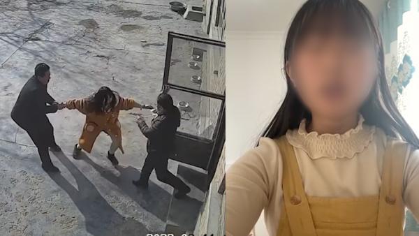 监控视频中,一名年轻女子穿着睡衣被家人强行从男友的屋子里拖拽并殴打,女子极力挣扎大喊仍被拖上汽车带离。一名年轻男子从屋里出去救女友,却被打倒在地。