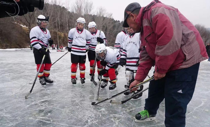 菜食河冰面上,赵纪生正在课上指导冰球队的队员们技术要领。延庆区珍珠泉乡政府供图