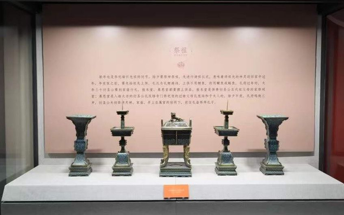 今年的主题是“福寿康宁”。这四个字出自《尚书》的洪范篇,其中提到“五福:一曰寿,二曰富,三曰康宁,四曰攸好德,五曰考终命。”博物馆的展览,分为三个单元:第一单元是“福”,就是说的新年祈福,古人通过各种仪式,向上天祈求来年的兴旺发达;第二单元是“寿”,以孔府祭祖祈寿为切入点,包括孔府在新年期间关于吃饭穿衣方面的特色,通过新春老幼团圆气氛的营造,来表现在家庭成员之间的年俗;第三单元是“康宁”,以喜迎新春的视角,来寄托身体康健、美好安宁的希望。