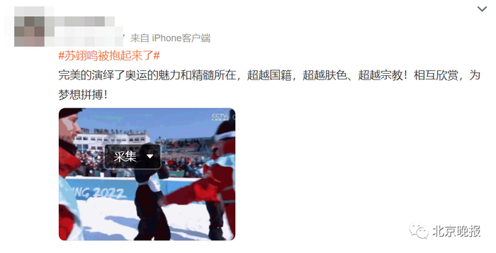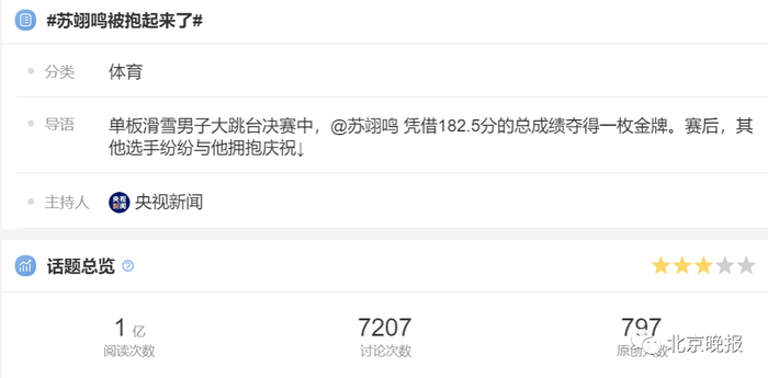 随后相关话题“苏翊鸣被抱起来了”冲上热搜——
