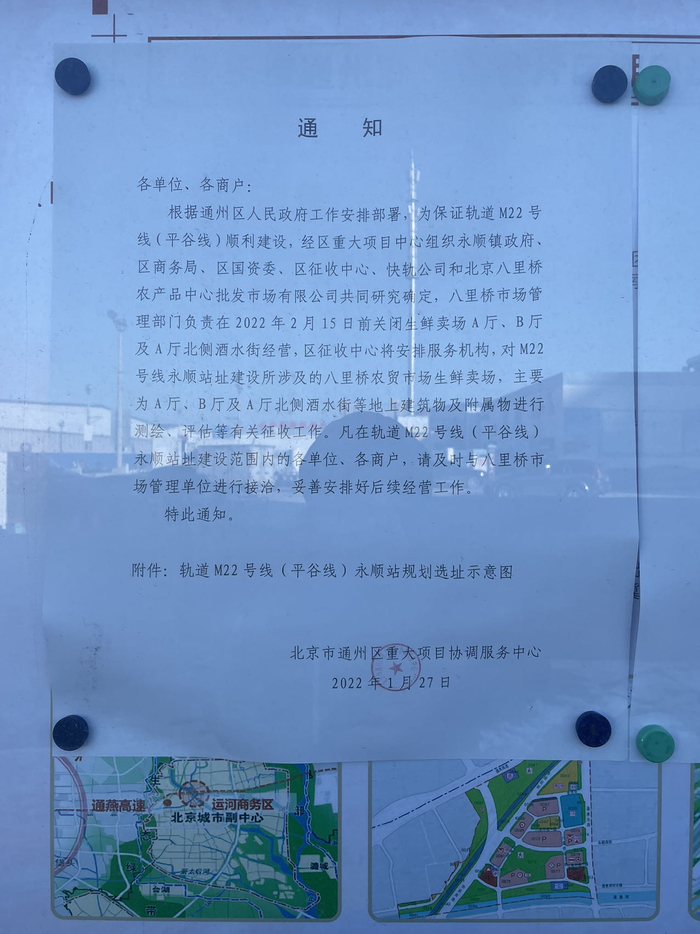 八里桥市场部分业务关停换址,与轨道交通 22 号线工程建设有关。记者从通州区了解到,通州区永顺站建设已正式启动,八里桥农产品批发市场A、B 生鲜零售厅和北侧酒水街就在该站点的选址范围内,目前通州区正同步开展入户清登工作。