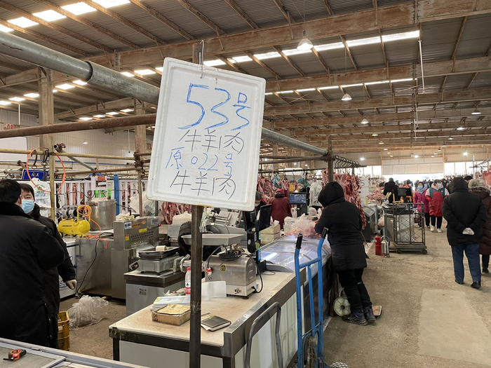 暂停营业的鲜肉零售业务目前转移到了被称为“八道”的“土豆等根茎类”大棚区。当天是鲜肉零售店铺搬迁后第一天营业,记者注意到,不少商铺都在醒目位置挂起了牌子,标明过去在鲜肉零售B区的摊位。“第一天生意还可以,店面和过去差不多大,我们现在正常营业。”一位牛羊肉摊位店主告诉记者。