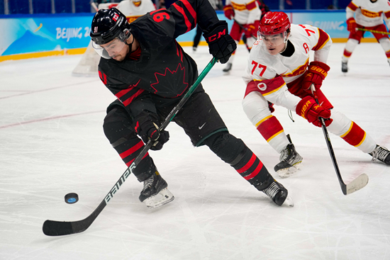 2月15日晚,北京冬奥会男子冰球淘汰晋级赛,中国队77号球员郑恩来正在防守加拿大队员。 视觉中国供图