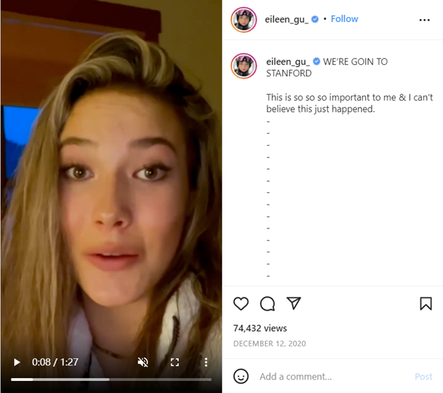 2020年12月,谷爱凌在Instagram(IG)上发布了一段视频,宣布自己被斯坦福大学录取。