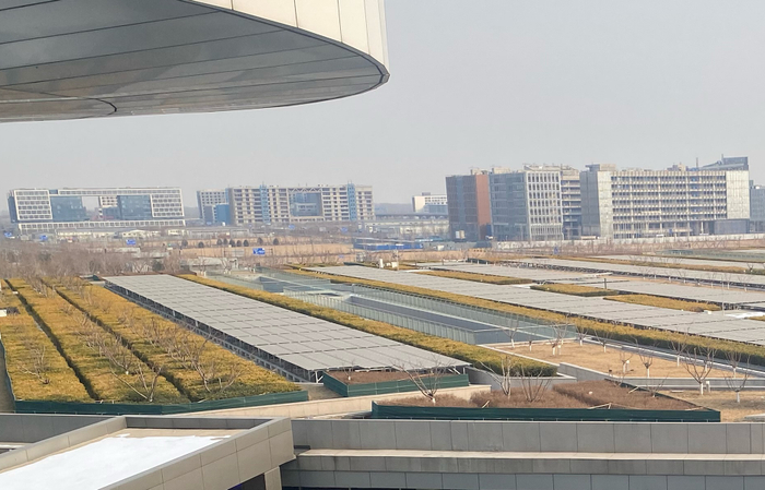 走上停车楼的楼顶,一排排太阳能发电板面朝天空晒着太阳;而在发电板四周,一道道常绿灌木仿佛又组成了庞大的“迷宫”;到了春天,四周的桃树竞相开花,屋顶便如同一座被精心打理的花园,默默迎送着来往机场的旅客们。在北京大兴机场,机场停车楼太阳能光伏发电项目于近期顺利投用,在为停车楼提供绿色能源的同时,更实现了光伏与屋面景观绿化的完美结合。
