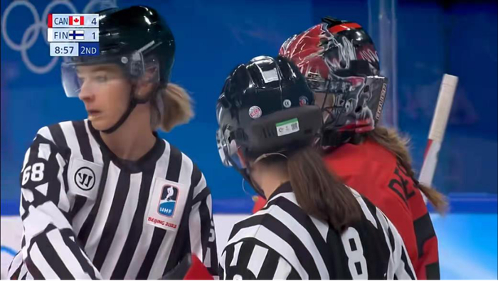 为了让观众更有带入感,很多参赛队员的身上也携带有无线摄像设备。例如,在2月5日女子冰球芬兰与加拿大的比赛中,上图中芬兰8号选手的头盔后部就有一个贴有绿色标签的无线电设备,这是一台无线摄像机,它们普遍使用7GHz频段专用频率,观众可以通过它身临其境地感受赛场上的争抢、碰撞。