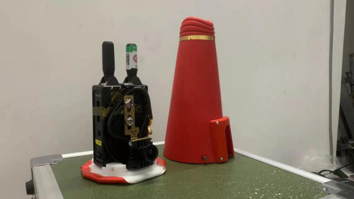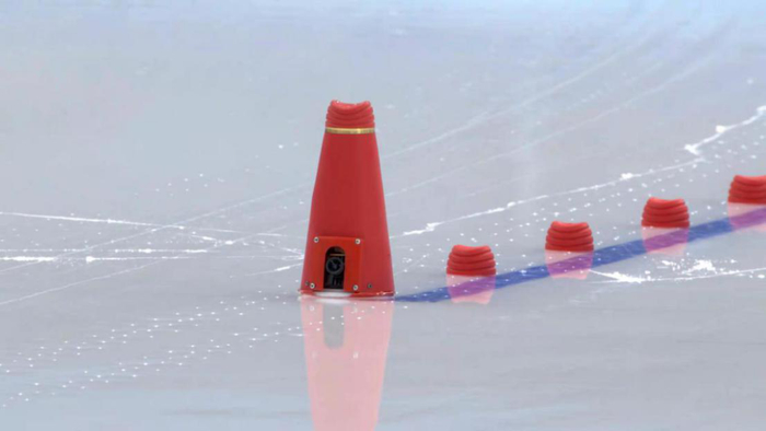 在国家速滑馆内,除了亮眼的“猎豹”外,冰面上还隐藏着另一种无线摄像机——冰面锥桶摄像机。它由摄像机、电池和无线发射装置三部分组成,被安放在用以标记赛道的红色锥桶中。冰面锥桶摄像机非常小巧,摄像机的体积甚至不到25立方毫米,就像一只在锥桶上打了个洞并从中探出头来的仓鼠。