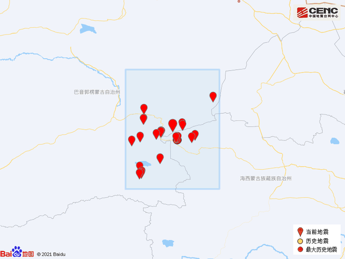 历史地震:根据中国地震台网速报目录,震中周边200公里内近5年来发生3级以上地震共25次,最大地震是2019年3月28日在青海海西州茫崖市发生的5.0级地震(距离本次震中48公里),历史地震分布如图。
