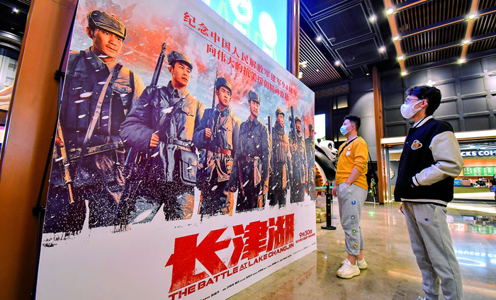 2021年10月7日,两名年轻人在北京一家影院观看电影《长津湖》的海报。新华社记者李欣摄