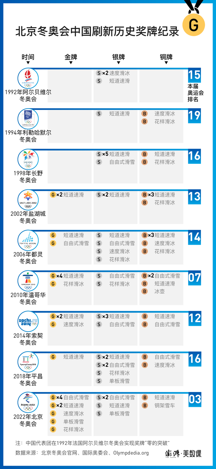 以2金为起点,中国在此后的冬奥会上不断寻求突破。2006年都灵奥运会,中国收获2金4银5铜,奖牌总数首次超过10枚。2010年温哥华冬奥会,中国创纪录夺得5枚金牌,首次在一届冬奥会上位列奖牌榜前十。此后的2014年、2018年两届冬奥会,中国虽然未在奖牌榜上取得新的突破,但在守住短道速滑、自由式滑雪等传统强项夺牌点的同时,不断在分项成绩上取得突破。