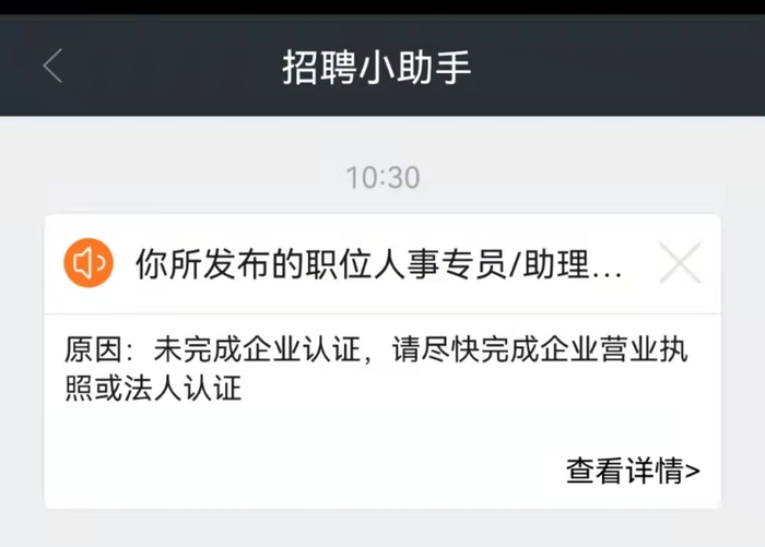 有意思的是,同样是在提示招聘信息发布成功的10时30分,招聘小助手发来通知称,发布的岗位信息审核未通过,原因是未完成企业认证。