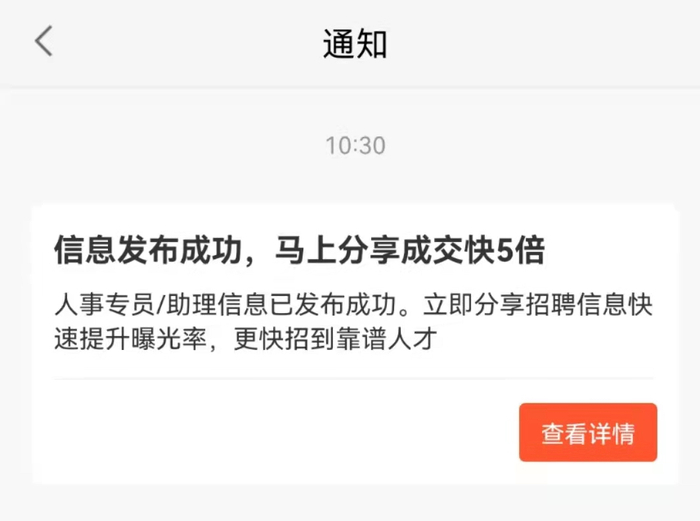 当天上午10时30分,有通知提示该招聘信息发布成功。