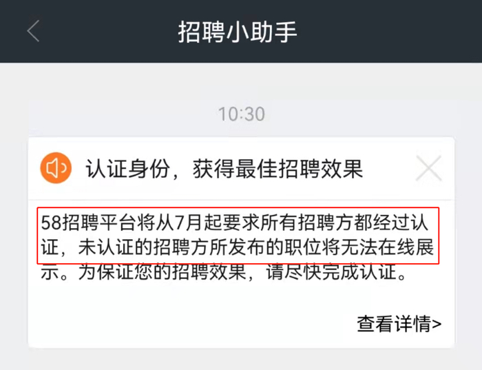 红星资本局注意到,招聘小助手发来的一份通知中提到,58招聘平台将从7月起要求所有招聘方都经过认证,未认证的招聘方所发布的岗位将无法在线展示。