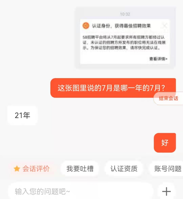 2月19日,红星资本局就此询问58同城的客服,对方表示,上述通知中的7月指的是2021年7月。而后,该客服又改口称,“这个(通知)是很早就有了,很多年了,现在都要认证。”