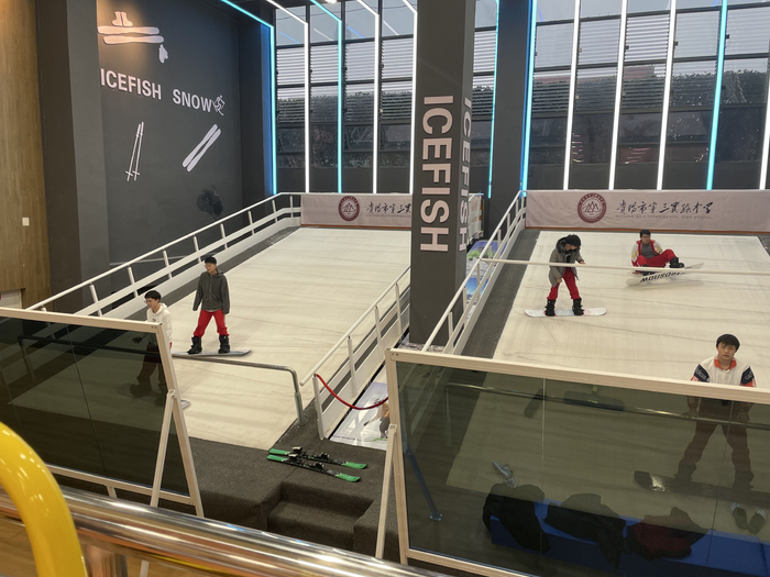 除了学习冰壶,在冰雪选修课上,孩子们也能体验滑雪。冰雪馆内有6台辅助滑雪设备,学生可以在长9.5米,宽4.8米,坡度可调节13度到18度的旱雪场地上,脚踏单板或双板练习平衡能力和技术动作。
