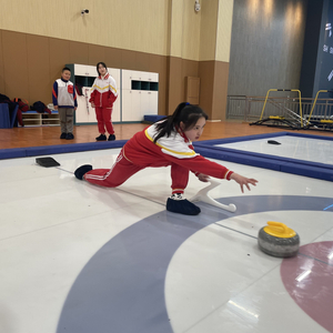 冰雪馆宽敞、气派。在陆地冰壶竞技赛道上,24米长的仿真冰赛道光滑如丝,48个重约10公斤的冰壶齐整地摆放在储物柜里。掷壶时,学生们身体下蹲,脚踩在起踏器上用力向前蹬,身体轻盈地向前跪式滑行。