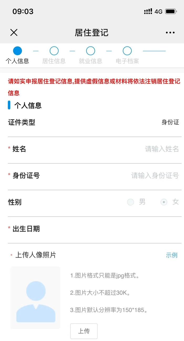 按要求填写真实信息并上传相关照片后,点击“提交”,即完成申报程序。属地派出所收到申报信息后将按照有关规定组织审核,经派出所核查申报信息属实符合办理条件,办理登记满六个月后,可到居住地派出所直接办理居住证。