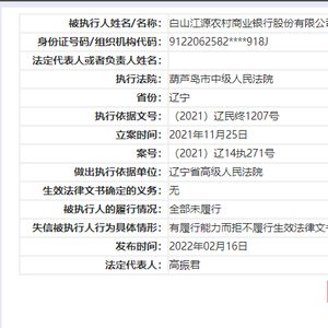 近日,中国执行信息公开网公开信息显示,吉林白山江源农商行(以下称江源农商行)被法院列为失信被执行人,具体情形为“有履行能力而拒不履行生效法律文书确定义务”。