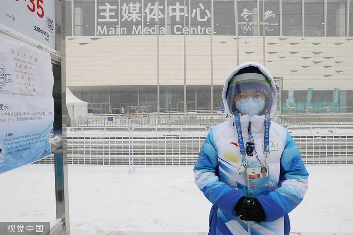 2022年2月13日,北京迎来虎年第一场雪,冬奥会上的工作人员在大雪中执勤坚守岗位。
