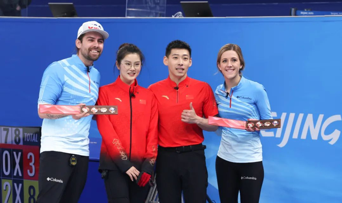 2月5日,中国队选手范苏圆(左二)、凌智(左三)与美国队选手克里斯托弗·普利斯(左一)、维姬·佩辛格在赛后合影。当日,北京2022年冬奥会冰壶混双循环赛比赛继续在北京国家游泳中心“冰立方”举行,中国队以5比7负于美国队。新华社记者 王婧嫱 摄
