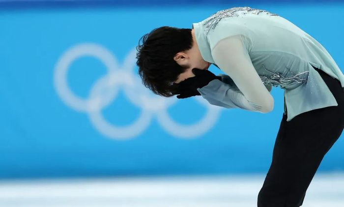 2月8日,中国选手金博洋在比赛后。当日,北京2022年冬奥会花样滑冰男子单人滑短节目比赛在首都体育馆举行。新华社记者 曹灿 摄