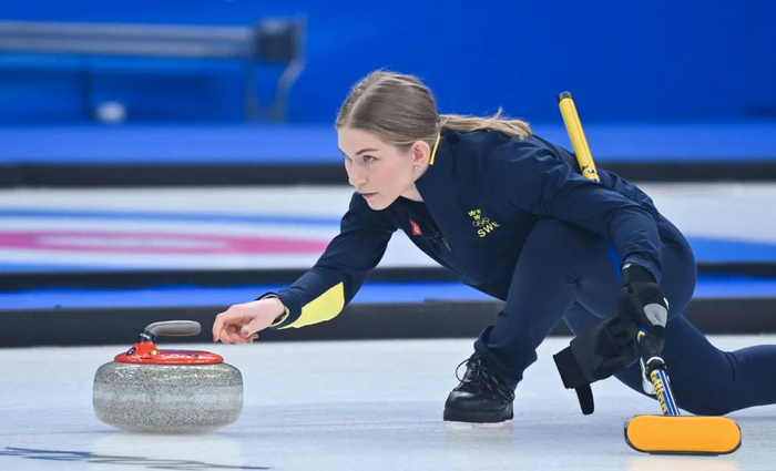 2月8日,瑞典队选手阿尔米达·德瓦尔在比赛中。当日,在北京国家游泳中心“冰立方”举行的北京2022年冬奥会冰壶混双铜牌赛比赛中,瑞典队以9比3战胜英国队获得铜牌。新华社记者 黄孝邦 摄