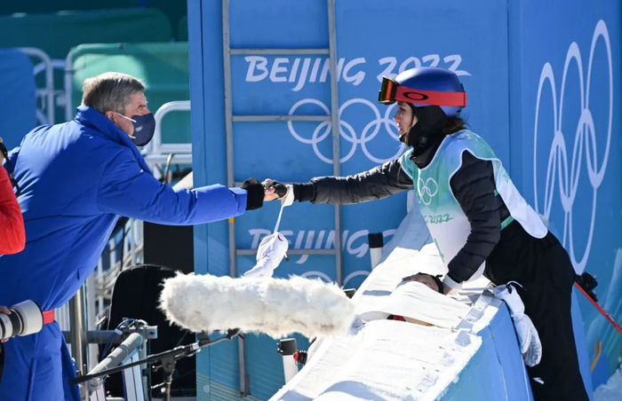2月8日,国际奥委会主席巴赫(左)向中国选手谷爱凌表示祝贺。当日,在北京首钢滑雪大跳台举行的北京2022年冬奥会自由式滑雪女子大跳台决赛中,中国选手谷爱凌夺得冠军。新华社记者 武巍 摄