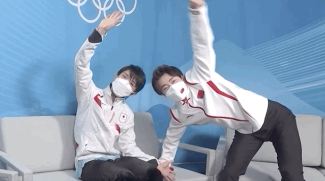 2月10日,在花样滑冰男子单人滑比赛中,中国队选手金博洋与日本队选手羽生结弦同组竞技。赛后,两人在休息室温暖互动。