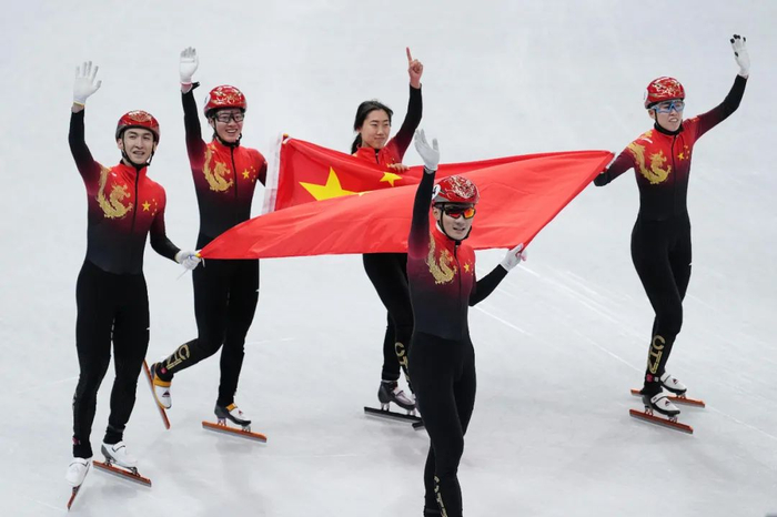 2月5日,中国队选手在比赛后庆祝。当日,在首都体育馆举行的北京2022年冬奥会短道速滑项目混合团体接力决赛中,中国队夺得冠军。新华社记者 熊琦 摄