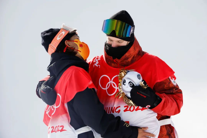 2月7日,获得冠军的加拿大选手马克斯·帕罗特(右)与获得亚军的中国选手苏翊鸣相互祝贺。当日,北京2022年冬奥会单板滑雪项目男子坡面障碍技巧决赛在张家口云顶滑雪公园举行。苏翊鸣夺得男子坡面障碍技巧银牌。新华社记者 费茂华 摄