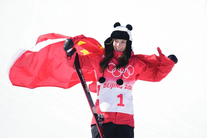 2月14日下午,苏翊鸣顺利晋级大跳台决赛。现场冬奥会徽映衬在苏翊鸣身后,仿佛为他加了一层飞行特效,十分酷炫。