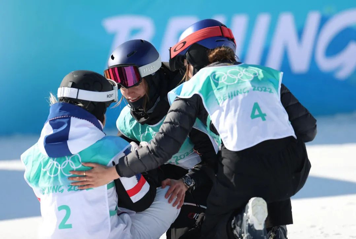 2月8日,中国选手谷爱凌(右)和瑞士选手玛蒂尔德·格雷莫德(中)在比赛后安慰法国选手泰丝·勒德。当日,北京2022年冬奥会自由式滑雪女子大跳台决赛在北京首钢滑雪大跳台举行。新华社记者 丁旭 摄
