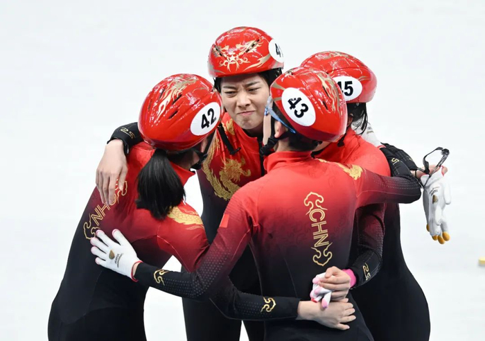 2月13日,中国队选手在比赛后抱在一起。当日,在首都体育馆举行的北京2022年冬奥会短道速滑项目女子3000米接力决赛中,中国队获得季军。新华社记者 李尕 摄