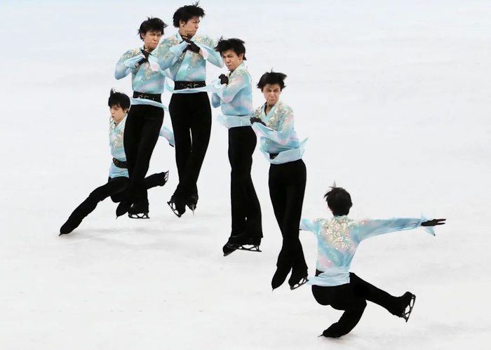 2月10日,日本选手羽生结弦在比赛中尝试阿克塞尔四周跳(拼接照片)。当日,北京2022年冬奥会花样滑冰男子单人滑自由滑比赛在首都体育馆举行。新华社记者 曹灿 摄
