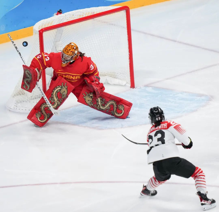 2月6日,中国队守门员周嘉鹰(左)比赛中防守。当日,在五棵松体育中心举行的北京2022年冬奥会女子冰球小组赛中,中国队对阵日本队。新华社记者 孟永民 摄