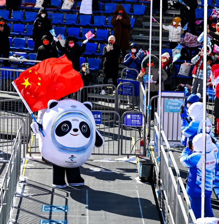 2月16日,吉祥物“冰墩墩”在现场和观众互动。当日,北京2022年冬奥会高山滑雪男子回转项目比赛在延庆国家高山滑雪中心举行。新华社记者 连振 摄