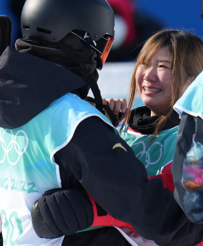 2月15日,中国选手荣格(左)和日本选手岩渕丽乐在比赛后拥抱。当日,北京2022年冬奥会单板滑雪女子大跳台决赛在北京首钢滑雪大跳台举行。新华社记者 李一博 摄
