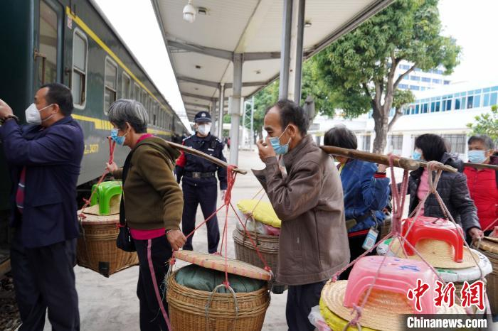 这位被昵称为“老张”的乘警,是南宁铁路公安局南宁公安处乘警支队民警张洪,2月17日和19日,“老张”值乘湛江至南宁K9314次列车,在这列火车上,有一支特别的队伍——“担担军”。