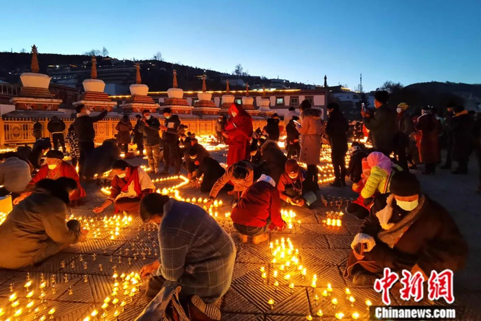2021年11月,在青海塔尔寺内,信众点燃酥油灯,祈福平安吉祥。中新社记者 张添福 摄