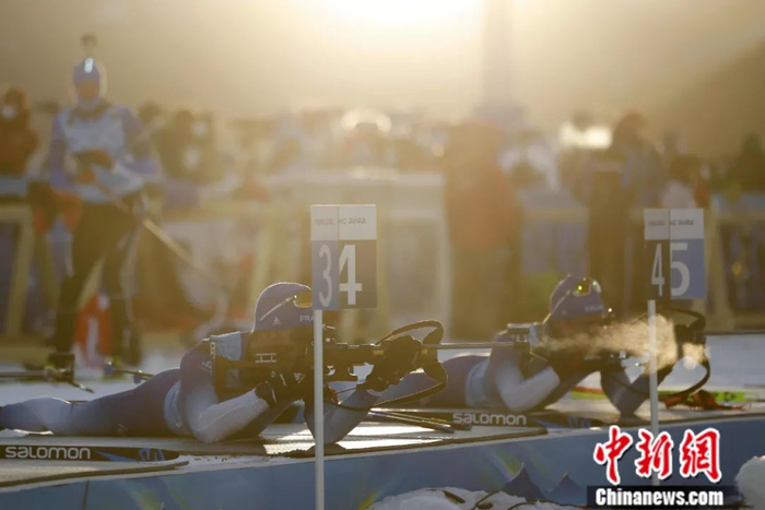 2022年2月2日,运动员在张家口赛区国家冬季两项中心训练,备战北京冬奥会。中新社记者 富田 摄