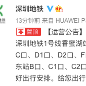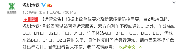 据@深圳地铁:自2月24日起,深圳地铁1号线香蜜湖站暂停运营服务,双方向列车不停站通过。此外,车公庙站C口、D1口、D2口、F口、J1口,竹子林站A口、B1口、C口、D口、E口,侨城东站B口、C1口、C2口暂时关闭,具体恢复时间待另行通知。请市民乘客提前做好出行安排。