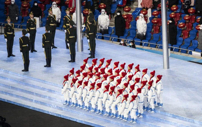 2月20日晚,鸟巢,冬奥会闭幕式上。灯光打在44位山里娃身上,娃娃们用希腊语唱起《奥林匹克颂》,他们的衣服和鞋上点缀着冰蓝色的鱼头剪纸图案,衣服厚厚的,显得萌态可掬,像中国传统的年画娃娃。孩子们的眼神纯真、声音纯净,边唱身体边随着旋律摇晃。在歌声中,奥林匹克会旗缓缓降下。